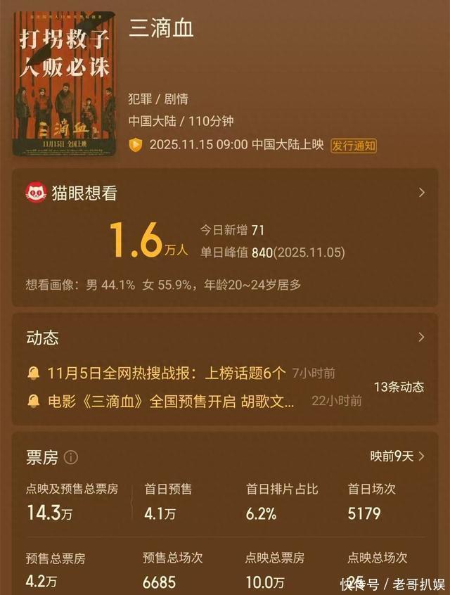 11月6日,院线电影《三滴血》开启网络预售已经满一日。然而,根据猫眼专业版的数据来看,这部电影只获得了4.2万元的预售总票房。如果这个走势继续下去的话,离该片上映时间11月15日还有10天左右,那该片的预售可能也只有几十万元。这部电影由胡歌、文淇主演,闫妮、宋佳、高叶、欧豪、李雪琴、杨新鸣、艾丽娅、张本煜、汪铎等十几位知名演员出演,可谓是明星云集。然而,这样的预售,显然预示着一次票房层面上的大扑街。