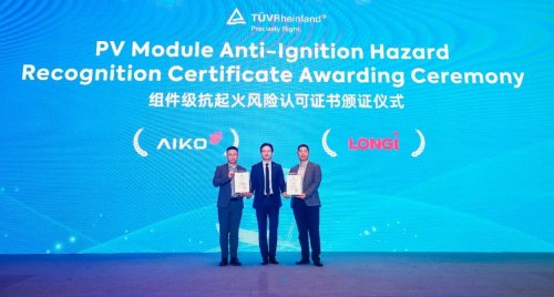 11月24日,在2025全球BC技术创新峰会上,TÜV莱茵向隆基颁发了组件级抗起火风险认可证书,BC组件的高安全性和防火特性获得了权威第三方认可。