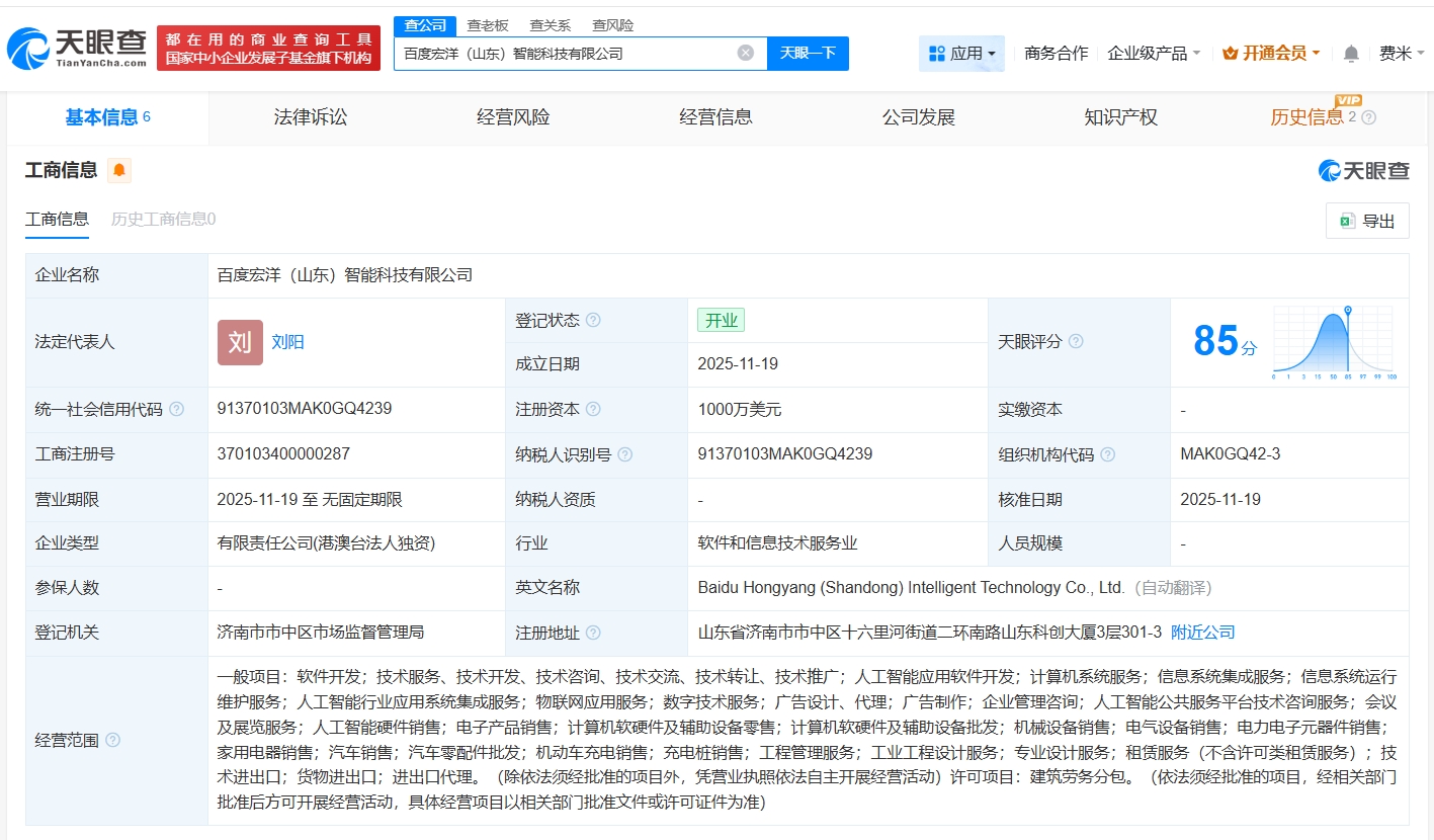 正规配资十大排名 百度在山东成立智能科技公司 注册资本1000万美元 正规配资十大排名 来源:元鼎证券 网站:元鼎证券_元鼎证券登录入口_股票配资平台官网 查看:193 日期:2025-11-26 09:37:14