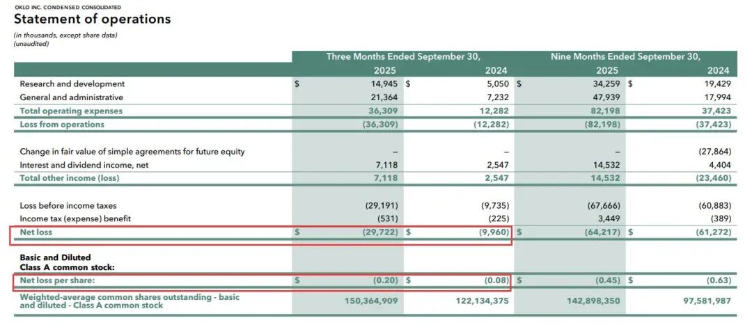 美东时间11日周二美股盘后,Oklo公布,今年第三季度每股收益(EPS)亏损0.20美元,较分析师预期的亏损额0.14美元高逾40%,较去年同期的亏损0.08美元显著扩大。三季度Oklo净亏损2972万美元,较分析师预期的净亏损额1820万美元高近60%,同样远超一年前的亏损额996万美元。